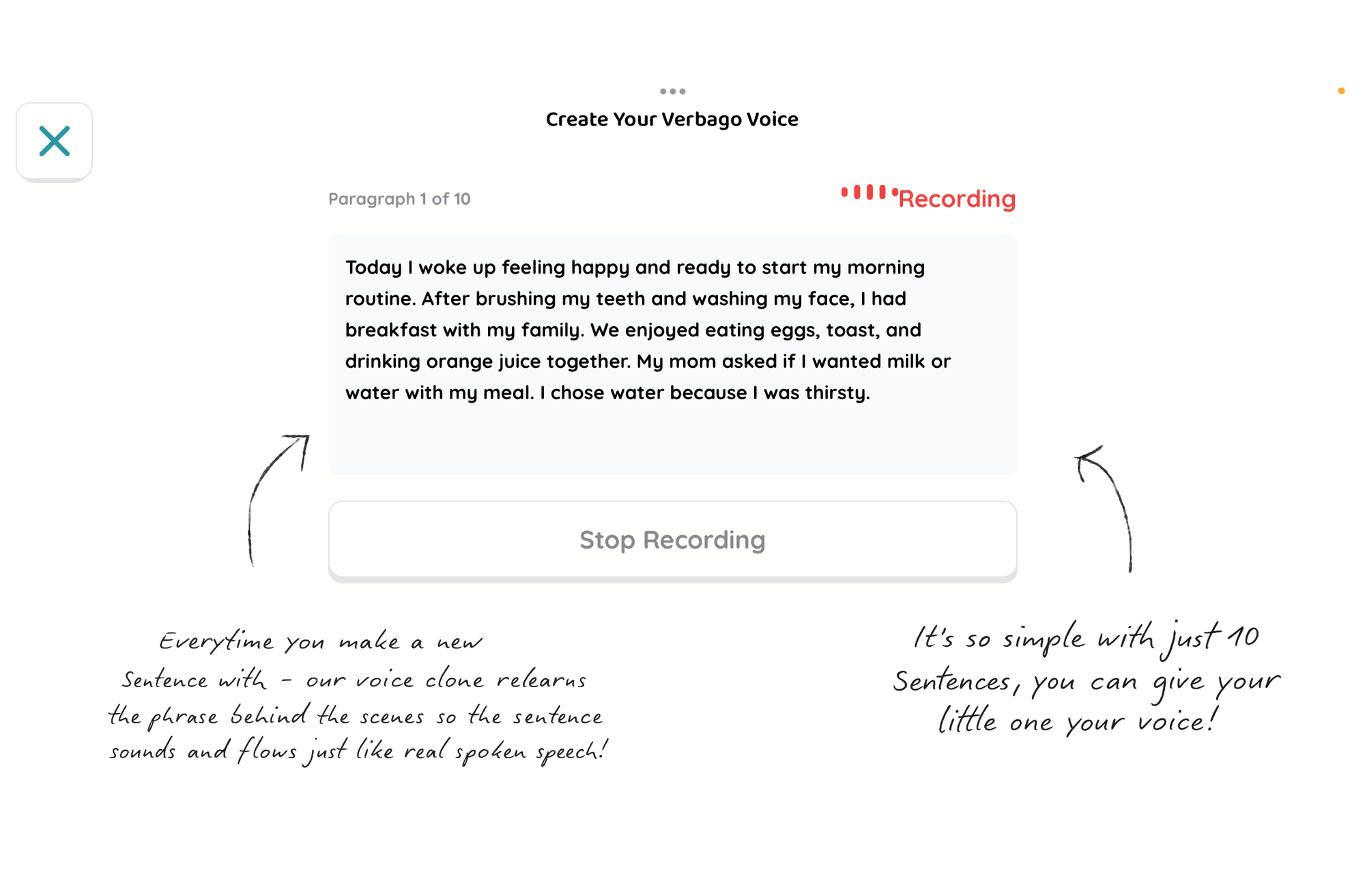 When you set up your child’s profile, you can record a few short sentences, and Verbago will generate an entire voice library that sounds just like you or any loved one they adore. Their communication board can quite literally speak with your voice.